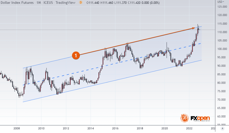 С точки зрения теханализа, этой осенью произошло важное событие, о котором вы могли и не подозревать. Фьючерс на индекс доллара достиг линии сопротивления (1), которая действует аж с 2008 года. Именно тогда в разгар финансового кризиса доллар установил важный пик, от которого берет начало трендовый канал, описывающий динамику USD в течение уже 14 лет.