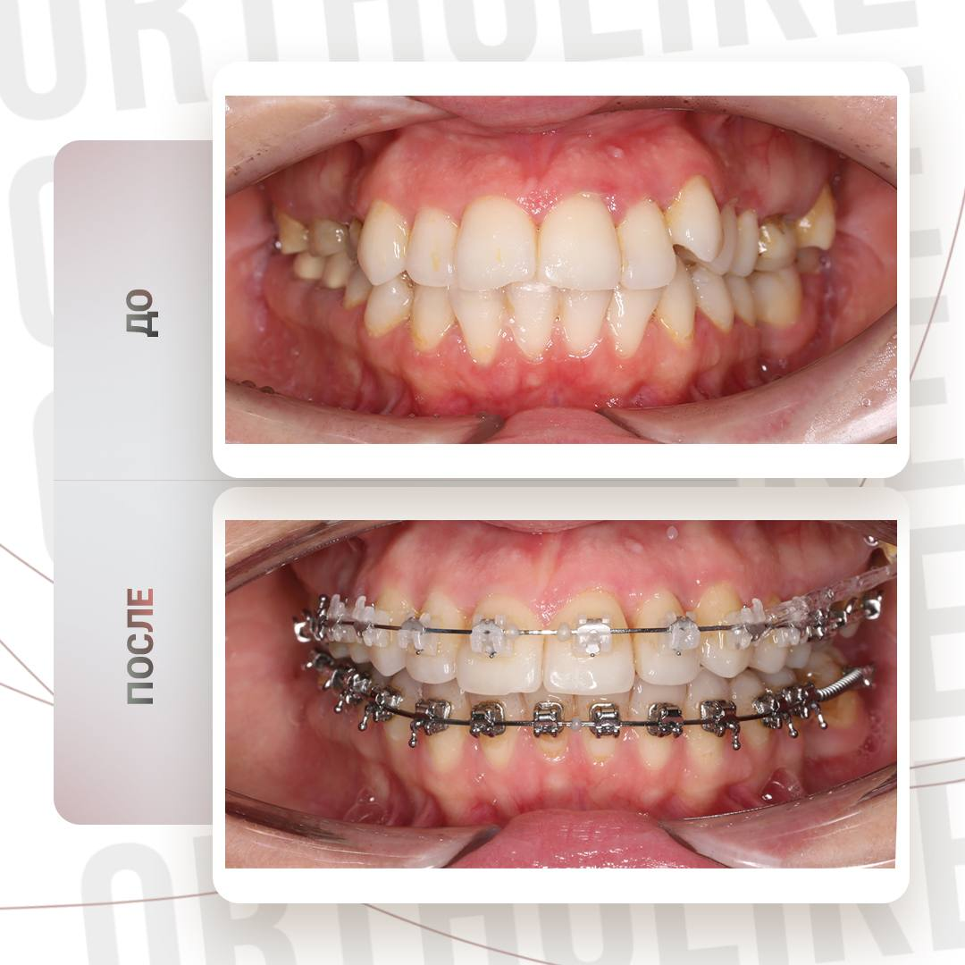 Пациенты в возрасте 30+ все чаще обращаются в стоматологическую клинику с вопросами о выравнивании прикуса. Большинство из них заблуждается и считает, что уже достаточно поздно заниматься здоровьем зубов. Но современная ортодонтия не ставит возрастных ограничений. Теперь в любом возрасте можно начать лечение и коррекцию зубного ряда. В практике стоматологов нашей клиники был интересный случай. Одна из пациенток, которой уже исполнилось 32 года, обратилась с рядом жалоб: При осмотре врач-ортодонт выявил еще несколько дефектов: Для восстановления правильного положения зубного было решено использовать наружную брекет-систему. На верхнюю челюсть установили керамические брекеты, на нижнюю – металлические. Уже через 9 месяцев коррекции и лечения были отмечены следующие улучшения: Следующий этап лечения связан с подготовкой свободного пространства и костной ткани для имплантации утерянной «шестерки». Так же будет проведена работа со смыканием с левой стороны. Врачи-ортодонты клиники OrthoLik