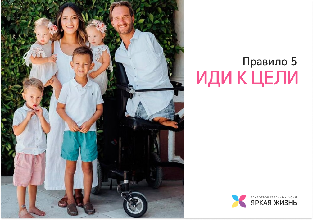 Правило №5 от Ника Вуйчича “Иди к цели” Было два человека, вдохновивших меня на выступления. Первый — Филипп, он не мог ходить и говорить. У него был остеомиелит (это когда тело отключается по частям). Ему было 25 лет, когда мы встретились. Он делал вебсайт и пытался вдохновить людей, вернуть им веру в жизнь. А второй человек — уборщик в школе. Он сказал: «Ты будешь оратором и расскажешь людям свою историю». Я хочу, чтобы вы знали: это был пожилой человек, и я уважал его. Но у меня и в мыслях не было стать оратором. Я собирался быть бухгалтером. Но он каждый день на протяжении трех месяцев говорил мне это. В конце концов, я согласился выступить. Тогда я понял, что могу тоже вдохновлять людей. Не важно, кто ты, можешь ты ходить или говорить — в твоей жизни есть цель.