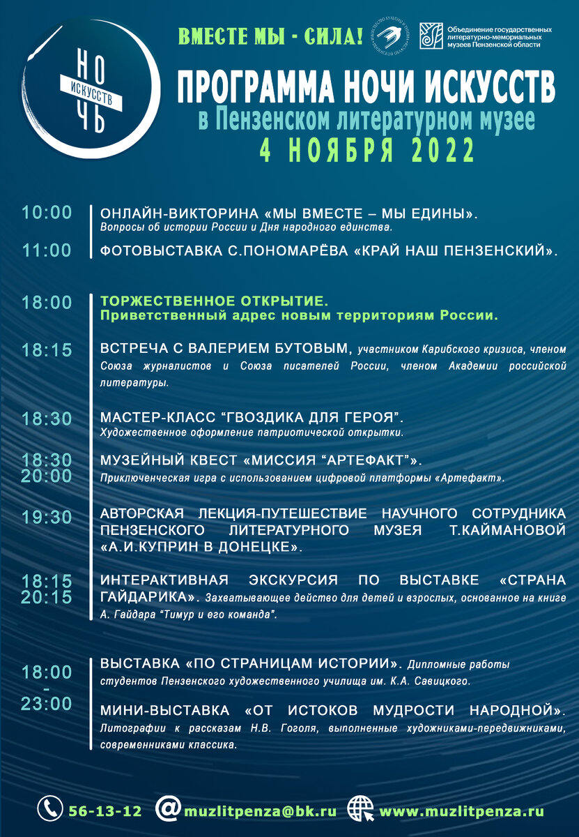 4 ноября во всех регионах России пройдет традиционная ежегодная акция «Ночь искусств». В этом году мероприятия акции будут приурочены к Дню народного единства и посвящены теме «Наши традиции». Категория 0+. Вход свободный.