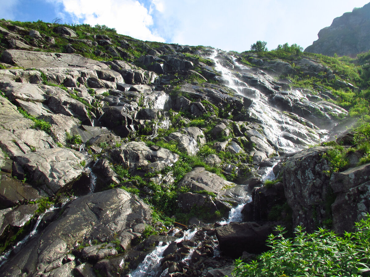 Живописные пейзажи на хребте Аибга успели несколько раз поменяться за время нашей прогулки у водопада. Сначала так ярко светило солнце, что даже слепило глаза, а солнечные лучи отражаясь от водопада, играли солнечными зайчиками. Потом над горами собрались облака, спустились в долину с водопадом, и при свете солнца заморосил дождь, который в народе называют грибным. К счастью, он быстро прошёл, и над альпийскими лугами появилась радуга. Все эти смены природных явлений мы сняли на видео, которое я постараюсь опубликовать в ближайшее время. Подписывайтесь на мой канал, чтобы не пропустить новые публикации.