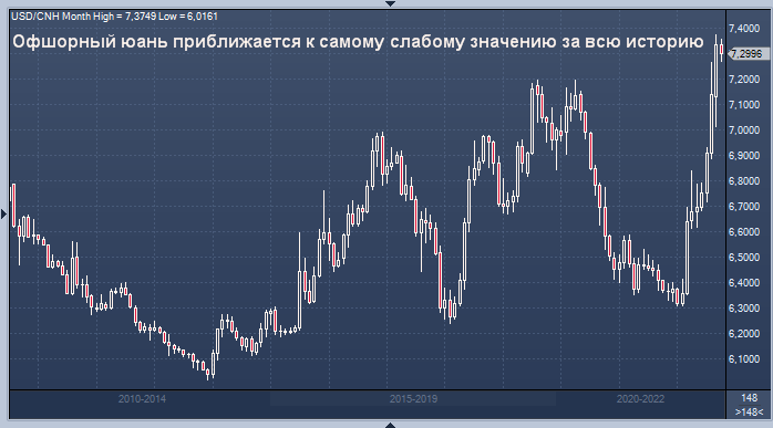 Рынок начал бояться упорядоченной девальвации юаня. Китайский юань падает на фоне самого слабого фиксинга ЦБ с 2008 года График офшорного юаня к доллару интервалами в 1 неделю Офшорный юань снизился, приблизившись к своему самому слабому значению за всю историю, поскольку Китай сигнализировал об ослаблении контроля над валютой, понизив котировку фиксинга. Валюта упала на 0,3% до 7,3567 за доллар после того, как Народный банк Китая установил фиксинг на почти 15-летнем минимуме. Этот шаг был предпринят после того, как юань упал как на внутренних, так и на зарубежных торгах в понедельник, поскольку Федеральная резервная система, как ожидается, на этой неделе проведет еще одно сверхмасштабное повышение ставок. Во вторник Китай установил фиксинг юаня на самом низком уровне с 2008 года. «Власти допускают постепенное ослабление фиксации, что указывает на растущую терпимость к дальнейшей корректировке спота в сторону снижения», — сказал Хун Гох, руководитель отдела азиатских исследований в Aus