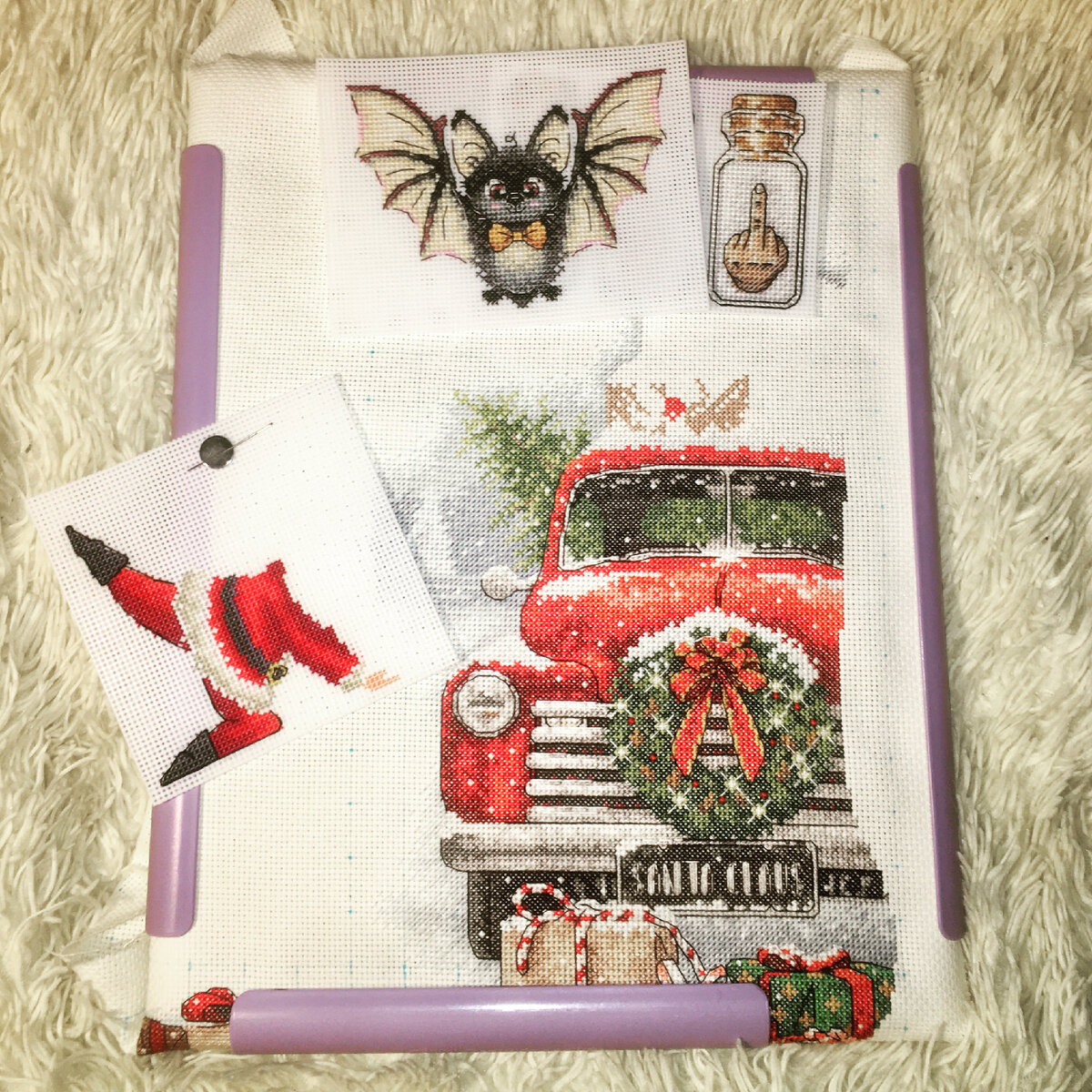 Старты: Санта Йога. Поза Тигра от Ксении Дмитриевой - 835х Финиши (интересно можно назвать финишом, если я вышила, но не вырезала и не оформила 🤔) Летучий джентельмен от Мп Студии - 239,5х Бутылочка от Ирины Коноплич - 404,5х Процессы: Сапожок Грузовик Санты от Dimensions - 9487х Итого: 10966х Мой личный рекорд за этот год. Обогнала январь на 650 крестиков. Хотя обычно январь бьет все рекорды по количеству вышитого из за долгих выходных. Покупки: 471 руб. нитки ДМС 5 шт 221 руб. нитки Мадейра металлик Итого: 692 руб. Покупок не много, докупила не достающие мулине на Санту и металлик заказала на него же, хочу попробовать использовать вместо бисера.