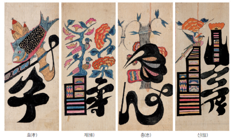 Буквально на днях написала о значения корейской народной живописи, и только сейчас поняла, что пропустила один важный вид картин- картины с иероглифами (문자도). Представляют собой эти картины сочетание китайского иероглифа и нескольких картинок. Обычно картинки расскрывают смысл изображения, но если честно, не всегда легко расшифровать тайный замысел корейских художников прошлого. Немного истории: считается, что такие изображения появились примерно в 17 веке, но стали популярны уже в 20 вместе с увлечением народными сказками. Мне кстати кажется, что чем-то такие картины похожи на заглавные буквы в книжках со сказками(буквица). Специально даже нашла наши варианты сказок для сравнения =) Тут можно спросить, а почему же на корейских картинах изображали китайские иероглифы, а не корейский язык, который был придуман ещё за 200 лет до появления этих картин. Причина проста: как у нас в России дворяне говорили на французском (вспомним Пушкина или Толстого), так и для образованного корейцаязык