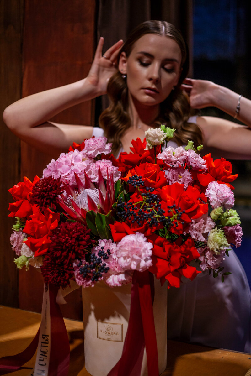 Протея - экзотический и многогранный цветок, в котором могут сочетаться разные цвета и формы. Кроме того из-за довольно крупных размеров самого цветка, его необходимо правильно окружать другими цветами, чтобы они правильно подчеркивали бутон, а не терялись на его фоне. Несмотря на большое количество цветов в композиции, Протея здесь хорошо заметна и выделяется за счет своей оригинальной формы и цвета (сердцевина (медовый горшочек) светлая, а острые стебли тёмные). Как мы уже упомянули, протея имеет два цвета - бледно-розовый и тёмно-красный, ближе к бордовому. И в первом случае у нас протею дополняют гвоздики, гортензия и лизиантус, а во втором - хризантема. В качестве легкого перехода между оттенками использована алая роза с вывернутыми лепестками. Здесь снова двухцветная протея, но уже стебли не тёмно-красные, бледные, едва отличающиеся от сердцевины цветка. Поэтому сам букет получился довольно спокойный и размеренный. В нём мы можем увидеть белые гвоздики, розовый лизиантус, белую к