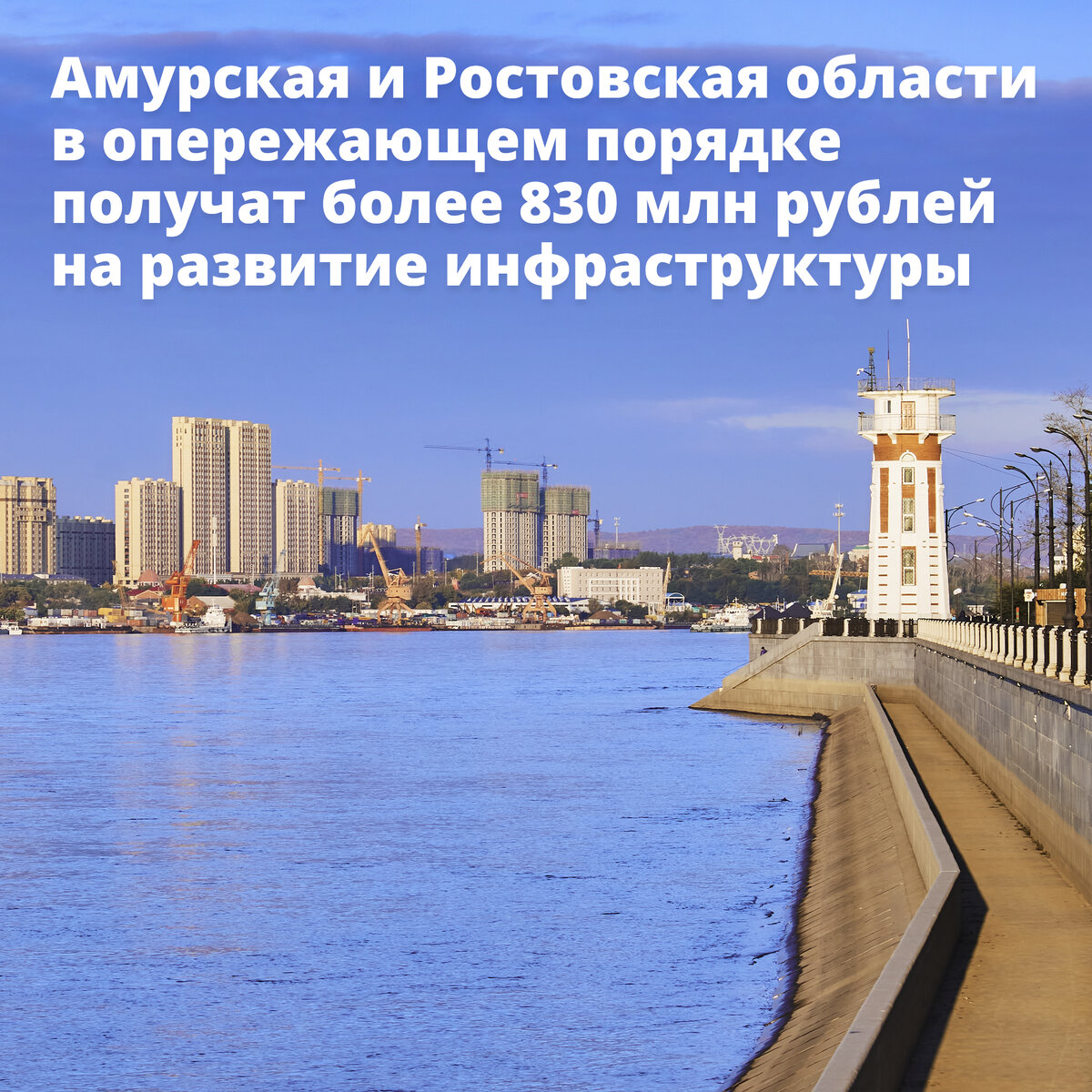 👷♂️Эти средства предусмотрены в бюджете на 2023–2024 годы, но будут направлены по распоряжению Михаила Мишустина регионам уже сейчас, так как строительные работы там идут с опережением. 💧Ростовская область получит свыше 605 млн рублей на продолжение реконструкции коллектора в Ростове-на-Дону, в том числе на вывод из эксплуатации и консервацию одного из поврежденных участков сооружения. 🚰Главная цель работы – повысить качество коммунальных услуг для местных жителей. 🌊В Амурскую область будет направлено 228 млн рублей на ускорение берегоукрепительных работ и реконструкцию набережной реки Амур в Благовещенске. ❗️Работа ведется в рамках федерального проекта «Содействие развитию инфраструктуры субъектов РФ».