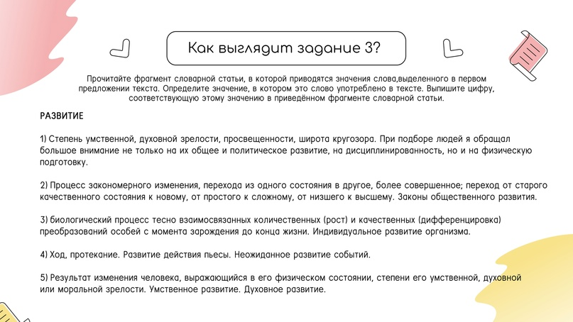 В этом задании тебя попросят посмотреть на словарную статью и выбрать значение, в котором употребляется одно из слов в тексте задания 1