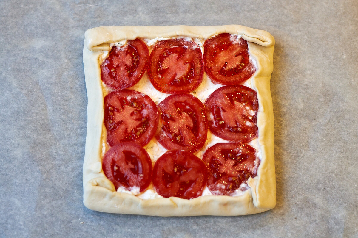 Помидоры нарезать кольцами. Выложить их поверх творожной начинки. Края пирога завернуть.