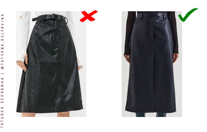 Если есть вставки из других материалов, отрезной низ, вообще, любой дизайнерский “изюм”, то проходим мимо таких юбок
