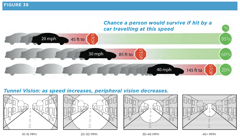 Ежегодно в результате дорожно-транспортных происшествий погибает более 1,2 миллиона человек, почти столько же, сколько умирает от ВИЧ/СПИДа. И сегодня в данной статье мы разберём способы того, как можно сделать города более безопасными для человека. 1. Снизьте скорость дорожного движения. Низкая скорость автомобиля, особенно ниже 40–50 километров в час, резко снижает риск гибели людей. На схеме ниже показана длина тормозного пути и угол обзора водителя, которые напрямую зависят от скорости автомобиля. И уже от них зависит, сможет ли водитель быстро отреагировать на появившегося на дороге пешехода и вовремя остановиться. Города могут ввести низкоскоростные зоны и «успокоение движения на всей территории», включая лежачие полицейские, островки безопасности, повороты на дороге (шиканы), расширение бордюров и приподнятые пешеходные переходы. Исследования показывают, что лежачие полицейские могут снизить скорость автомобиля с более чем 36 км/ч до менее чем 25 км/ч. Париж, например, используе