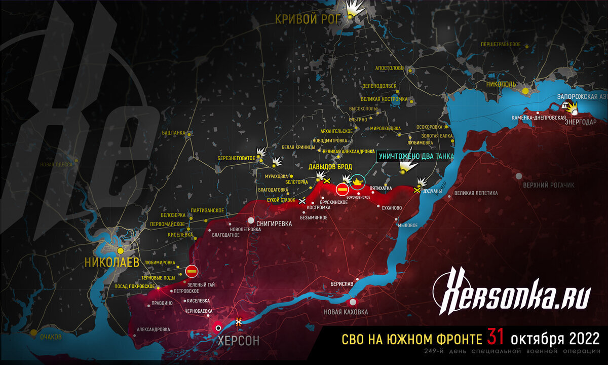 Войска РФ начали штурм Марьинки, дошли до центра посёлка и производят зачистку. Под Херсоном идёт обмен ракетными ударами. За последние 24 часа бойцы РФ нанесли ракетные удары по Березнеговатому и уничтожили позиции противника.