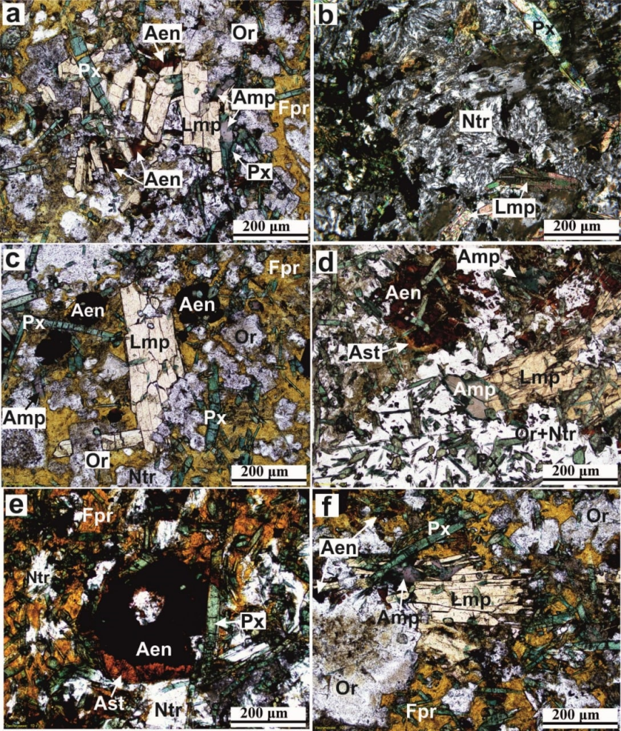 «Дайка содержит значительные количества ниобия, циркония, бария, стронция, железа, титана, а также летучих компонентов (которые помогают снижать температуру кристаллизации, вязкость сплава, влияют на рост кристаллизационной способности минералов). Все это отражается в ее минеральном составе: слагающая ее порода состоит из таких чрезвычайно редких минералов как лампрофиллит, энигматит, астрофиллит, нунканбахит. Кроме того, в породе встречается много низкотемпературных минералов: ортоклаз, натролит и феррипирофиллит, наличие которых свидетельствует о замещении ранних высокотемпературных минералов поздними низкотемпературными», — рассказывает заведующая лабораторией геохимии и рудоносности щелочного магматизма ГЕОХИ РАН, академик РАН Лия Когарко.