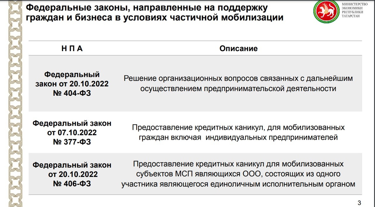 О мерах поддержки бизнеса для обеспечения стабильности российской экономики в условиях частичной мобилизации рассказал заместитель премьер-министра РТ - министр экономики РТ Он напомнил, что председателем правительства РФ8 октября был утвержден план функционирования российской экономики в условиях частичной мобилизации. В рамках реализации указанного плана на сегодняшний день приняты три федеральных закона, четыре нормативных правовых документа РФ и приказ Минэкономразвития РФ.