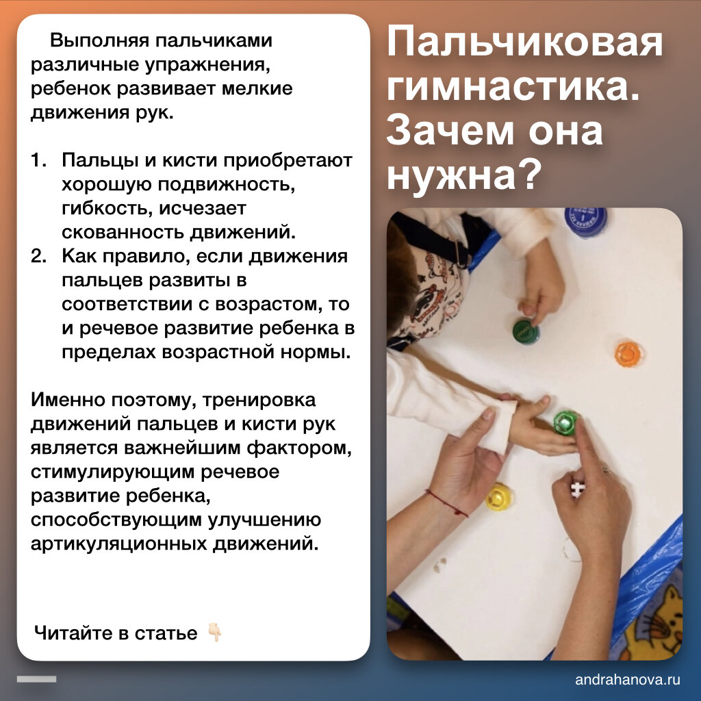 Начиная с шести месяцев, я рекомендую выделять 3-5 минут в день для пальчиковой гимнастики. Массирование ладошки, каждого пальчика и отдельно каждой фаланги можно выполнять под музыку или приговаривая какой-нибудь стишок. В возрасте десяти месяцев упражнения пальчиковой гимнастики для малышей должны становиться более разнообразными - детям следует давать катать деревянные шарики, перебирать кубики, различные пуговицы, карандаши, пряжу и многое другое. После полутора лет малышей следует учить застегивать пуговицы и различные застежки, зашнуровывать шнурки, а также развязывать несложные узелки. Сохраняйте данный статью, если она была для вас полезна. А так же консультация в Центре речи Ларисы Андрахановой доступна по звонку или на сайте.