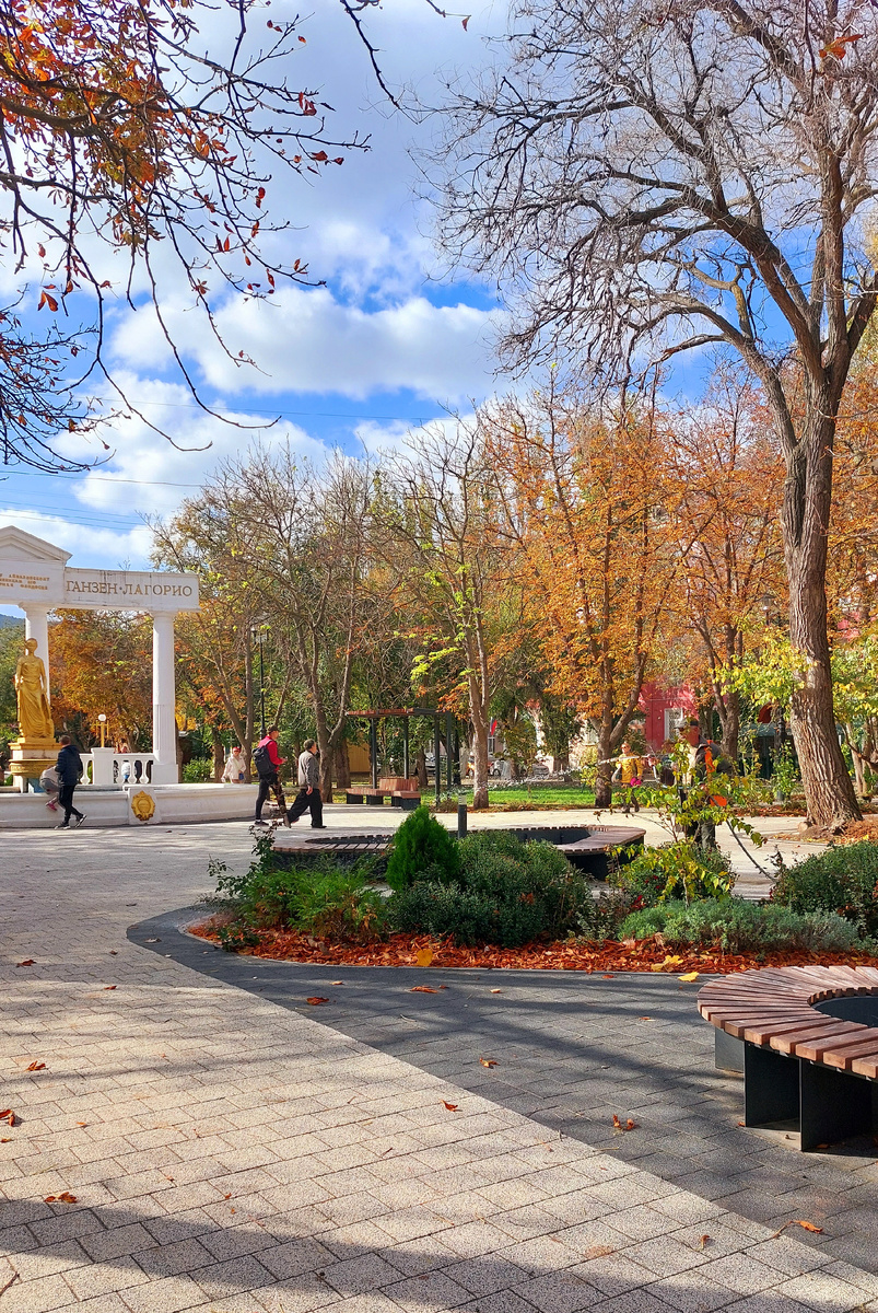 В самом центре города, недалеко от Вечного Огня и кинотеатра Крым, находится небольшой парк, с фонтаном Доброму гению. Парк был всегда, сколько себя помню, а фонтан - это относительно недавняя история, как и новые клумбы, которые пока что не вызывают ничего, кроме вопросов и недоумения. Одно хорошо, что за клубами ухаживают, и возможно, что даже на этих огрызках бывшей роскоши что - то вырастет, кроме скамеек под палящим солнцем. На фото, если присмотреться, видно человека со шлангом) У нас ещё солнечно, тепло и сухо, поэтому до сих пор поливают. Раньше в этом парке росли райские яблочки. Мы их пытались есть, но как - то неубедительно, до тех пор, пока бабушка не сварила из них варенье) И райские яблочки были оценены по достоинству) Сейчас тех деревьев нет. Но посадили новые, что меня радует. Хоть и не яблони, а акации) Здесь же, на первом этаже жилого дома, находился универмаг Солнечный, в котором, пожалуй, каждый житель нашего городка, хоть что нибудь, да покупал) В торце магазина