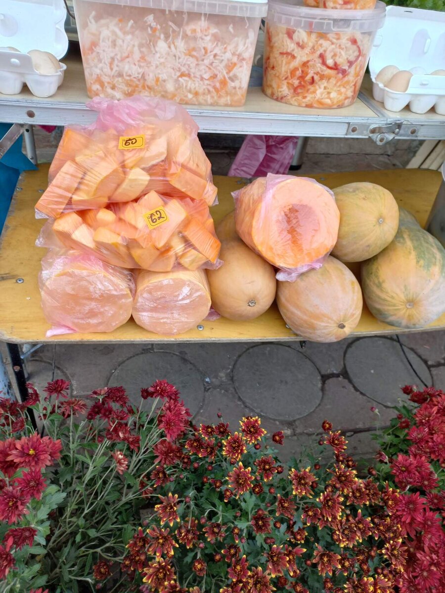 И торговать то уже нечем, выращенное с огорода распродано, теплицы уже закрыты, обработаны и закрыты. Вот только зелень еще осталась в теплице, сама взошла, укроп и в углу петрушечка. Надо срезать, продать, пропадет же, жалко будет. Да тыква, покупатель просит принести на рынок. Кому целую, кому половинами, а кто-то просит уже нарезанную. Цена тыквы по 70-60 руб за нарезанную и 50 целую. Хотя, цена у всех разная. Кто-то стоит продает по 30 рублей, а кто-то по 100. У каждого свой покупатель.