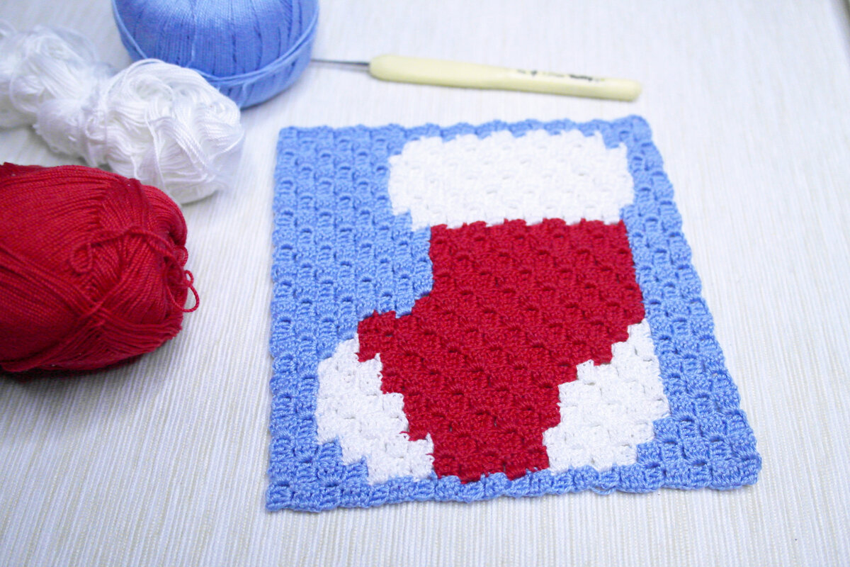 Вязаная подставка под чашку "Новогодний сапожок". Техника вязания крючком С2С.
