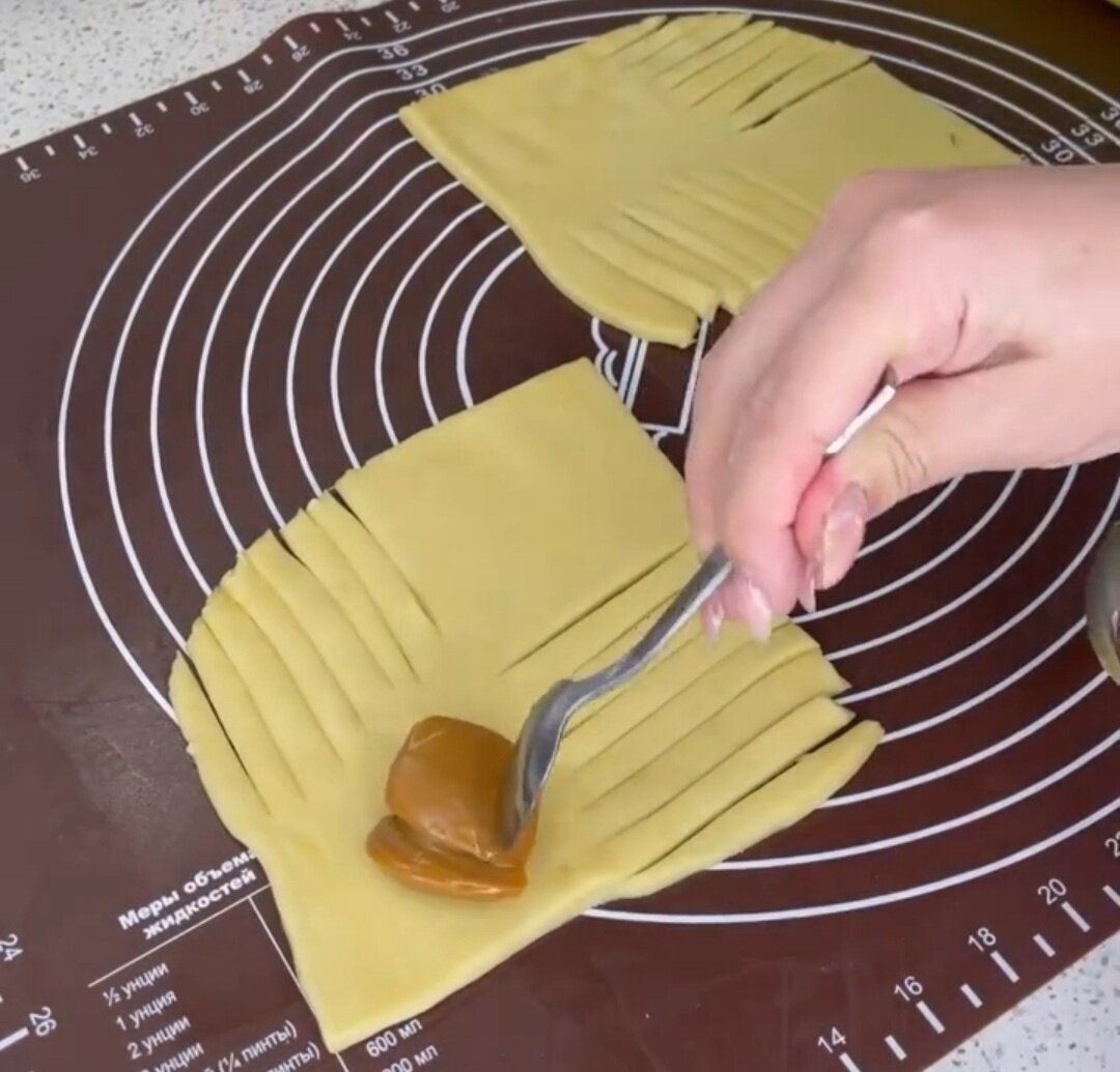 Сегодня поделюсь с вами одним из моих самых любимых рецептов песочного печенья. С варенной сгущенкой сочетание просто фантастика. Не только вкусно и красиво. Покорит сердце любого сладкоежки! Очень нежное песочное тесто, само по себе очень вкусное, даже без начинки. Берите на заметку! На столе тают в минуту, так что готовьте побольше, если у вас намечаются гости или просто хотите порадовать своих родных! Начинаем готовить. В муку добавляем сахар, холодное масло, даже я бы сказала ледяное масло, нарезанное кубиками, и делаем крошку. В получившуюся крошку добавляем сметану и желток, хорошо вымешиваем руками и получается очень послушное тесто. Убираем тесто в холодильник на 40 минут. Делим на несколько частей и раскатываем в тонкий пласт. Делим на квадратики и делаю надрезы с двух сторон. Добавляем начинку и накрываем второй частью придавливаем края и начинаем по очередной складывать полоски. Отправляем в разогретую духовку, духовка должна быть очень сильно разогрета, до 200 градусов. Жел