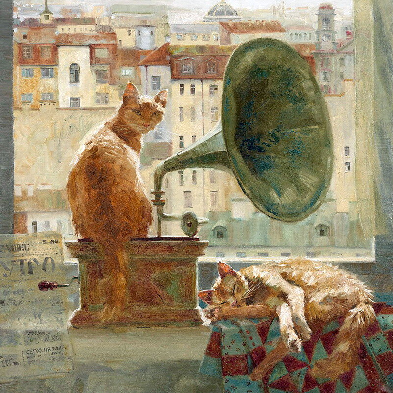 Художница Мария Павлова, Санкт-Петербург, Россия. Родилась 28 января 1979 года в Ленинграде. Окончила Санкт-Петербургский Академический художественный лицей им. Б.В. Иогансона и Санкт-Петербургский государственный академический институт живописи, скульптуры и архитектуры имени И. Е. Репина (мастерская профессора В.В. Соколова). В 2005 году вступила в Санкт-Петербургский Союз художников. В 2006 ей была присуждена Государственная стипендия Министерства культуры Российской федерации, а в 2008 Мария победила на конкурсе молодых художников «Ориентиры IV» в номинации «Графика». Коты и кошки основные герои картин художницы. Но дома котов Мария не держит: у одной из двух её дочек - аллергия. Но недостатка в моделях нет: они сами приходят к художнице на дачу за вниманием и угощениями, а заодно становятся героями картин. Но позы и занятия у этих дачных натурщиков самые что ни на есть аристократичные. На картинах Марии Павловой они интересуются музыкой, книгами и сидят за роскошно сервирован