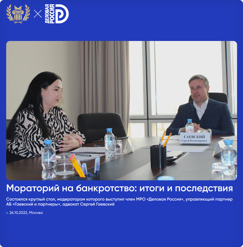 Именно так звучала тема круглого стола, прошедшего в среду 26 октября 2022 г. на базе московского регионального отделения «Деловой России». Инициатором встречи стал управляющий партнер АБ «Гаевский и партнеры» С. В. Гаевский, обратившийся к участникам со вступительным словом. «Особую значимость приобретает мероприятие в связи с тем, что среди нас присутствуют представители российского предпринимательства — те, кто на себе ощутил действие принимаемых государством мер поддержки, а значит, могут дать им независимую, объективную оценку». Основная часть мероприятия (непосредственное обсуждение итогов моратория) была открыта выступлением представителя ООО «Кинеко» — строительной компании, для которой мораторий «создал лишь препятствия для осуществления нормальной хозяйственной и производственной деятельности». Недобросовестные должники намеренно допускали неисполнение или же ненадлежащее исполнение своих обязательств, так как кредиторы на время лишились возможности инициировать процеду