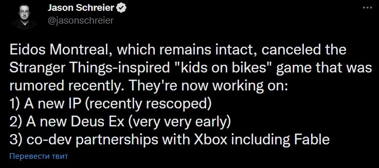 Известный журналист Джейсон Шрайер сообщает, что студия Eidos Montreal в данный момент занимается сразу тремя крупными проектами, один из которых, как заявляется, недавно был "изменен в размерах", другой — нечто разрабатываемое при сотрудничестве с Xbox. Наиболее интересной же является информация о том, что студия занимается разработкой новой игры серии Deus Ex. Сообщается, что в данный момент проект находится на "очень ранних" этапах разработки, Eidos намерены "сделать то, что Cyberpunk 2077 не смогла". О чем именно идет речь - неизвестно. https://youtu.be/uvSs5b6y-YM Официальной информации о новой части Deus Ex в данный момент нет, а потому остается только ждать и верить.