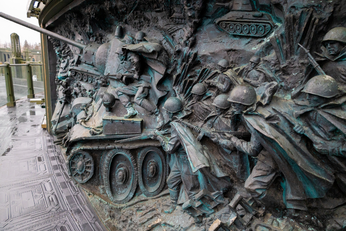 Внешняя отделка Главного храма Вооруженных Сил России разделена на несколько ярусов. На первом ярусе северо-восточной части храма расположен горельеф с изображением Курской битвы: Совокупность стратегических оборонительных и наступательных операций Красной Армии в Великой Отечественной войне. Здесь запечатлен момент нанесения фронтового контрудара силами 5-й гвардейской танковой и 5-й гвардейской армиями в районе Прохоровки. Работа выполнена Народным художником России, скульптором Салаватом Щербаковым.