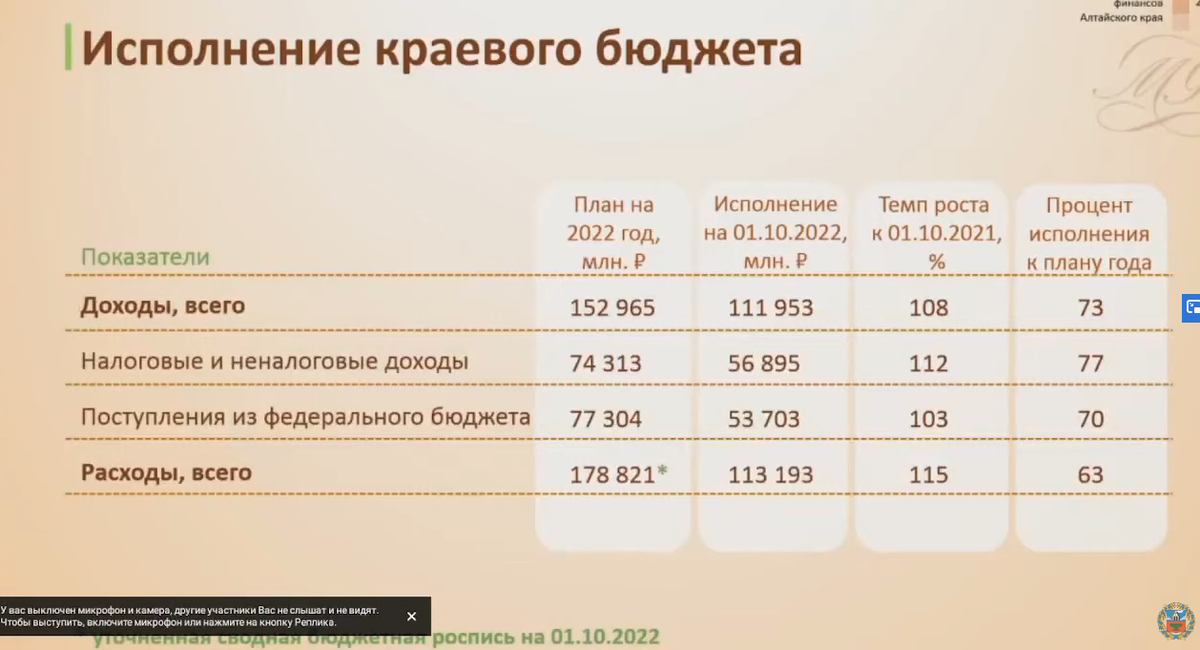 Бюджет Алтайского края за девять месяцев 2022 года исполнен с показателями, которые превышают аналогичные значения за такой же период (январь-сентябрь) прошлого года. Так, доходы за три квартала 2022-го составили 111,9 млрд рублей (+8%), а расходы — 113,2 млрд (+15%). Об этом в ходе заседания регионального правительства 2 ноября рассказал министр финансов края Данил Ситников. Исполнение бюджета-2022 по налоговым и неналоговым доходам составило 56,9 млрд рублей, рост равен 12%. При этом поступление финансовой помощи из федерального бюджета составило 53,7 млрд (+3% по отношению к аналогичному периоду прошлого года). По словам Ситникова, на реализацию национальных проектов на территории Алтайского края в 2022 году будет направлено более 24 млрд рублей. За девять месяцев текущего года на выполнение мероприятий потратили 14,3 млрд, или 59% от годового плана. На 1 ноября данный показатель составляет уже 71%, уточнил министр. Также Данил Ситников рассказал о работе над проектом закона о краев
