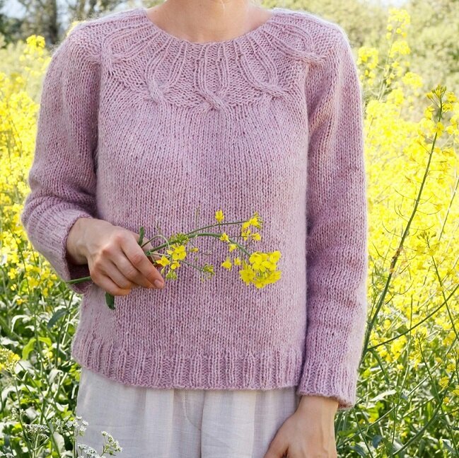 А вот здесь коса по рукаву смотрится уместно, так как перед и спинка связаны просто лицевой гладью: