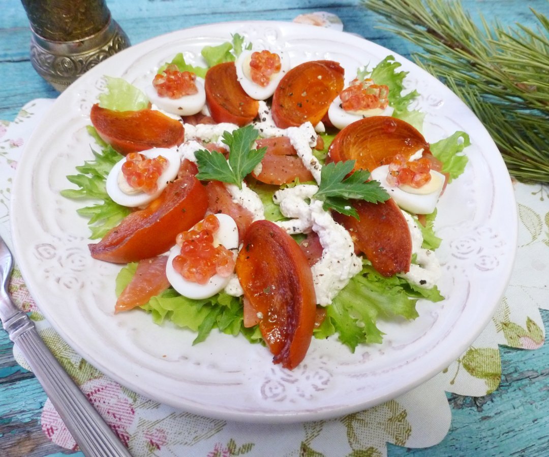 400 г форели, 250 г зелени спаржи, 8 перепелиных яиц, 200 г салата махровых сортов, 150 г помидоров, 1 лимон, 40 г кетовой икры, 50 г репчатого лука, зелень укропа, сахарный песок, соль. Заправка: 60 г винного уксуса, 80 г подсолнечного масла, молотый черный перец, соль. Спаржу очистить, отварить в кипящей подсоленной воде со щепоткой сахара ( примерно 7 минут), вынуть и охладить. Перепелиные яйца варить в кипящей воде примерно 2 минуты, затем обдать холодной водой и снять скорлупу до половины. Листья салата промыть и стряхнуть. Помидоры разрезать пополам. лимон нарезать кружочками и на них положить икру. Очистить луковицу, половину нарезать кольцами, половину порубить. Промыть зелень и измельчить. Филе вареной форели нарезать большими кусками. Смешать уксус, соль, перец, масло и рубленый лук. Салат, спаржу, филе рыбы, ломтики лимона с икрой, помидоры и яйца красиво расположить на блюде, посыпать кольцами лука и зеленью. Перед подачей на стол сбрызнуть заправкой.