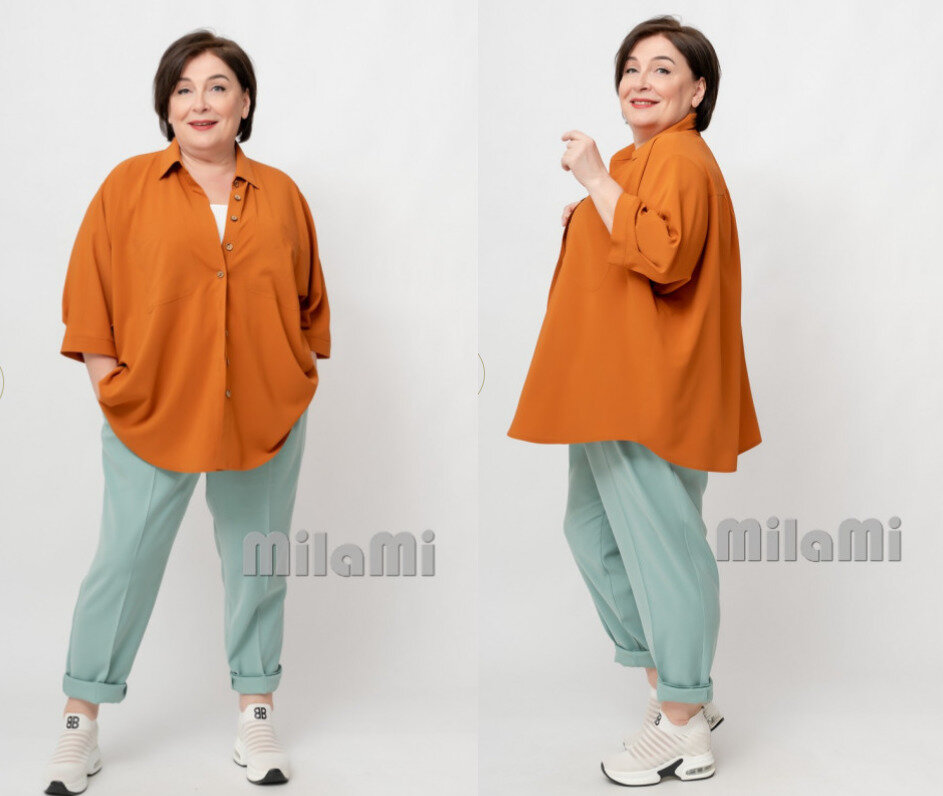 - Максимально простой, но удобный и стильный ансамбль. Комплект состоит из светло-голубых брюк прямого силуэта, штанины которых подвернуты снизу с образованием аккуратных отворотов, белой майки или топа и свободной рубашки цвета охры. Рубашка со спущенным плечом и застежкой типа «поло».