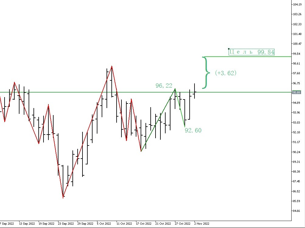 1. Сформирован разворот цены фьючерса марки Brent 2. Установлен краткосрочный максимум на уровне цены 96,22 3. Прошла трехдневная коррекция размером 3,62 доллара, установив краткосрочный минимум с ценой 92,60 4. Цена пересекла краткосрочный максимум, равный 96,22 Расчетная цель которая может быть достигнута в ближайшем будующем будет на уровне 99,84 доллара за один баррель нефти марки Brent. Вывод из всего это простой: