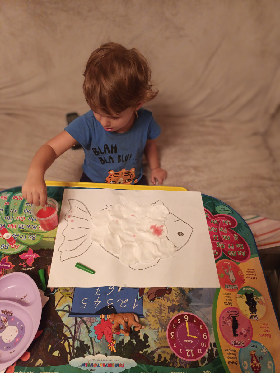 Ни для кого из мам не секрет для чего необходимо развивать мелкую моторику у ребенка. Сегодня мы, как раз этим занимались с помощью пипетки. Пипетка идеально подходит для детских пальчиков и тренирует пальчиковый захват. Кроме того детишки очень любят игры с водой, особенно если она яркого цвета. На самом деле сначала ребенку очень тяжело понять принцип. Но несколько раз наглядно продемонстрируйте малышу как это работает. Неплохо проделать это вместе, держа ручку ребенка в своей. И через пару минут вы увидите. Как это понравится вашему малышу и увлечет его на некоторое время. А всего то понаботся лист бумаги, клей (карандаш или пва), обычный фломастер (у меня под рукой был восковой мелок), стаканчик с водой, любая цветная краска и несколько ватных дисков. Диски я разделила пополам. На листе бумаги символично изображаем рыбу. И наклеиваем диски в виде чешуи Можно, конечно, сделать и посимпатичнее, но у меня не было времени. Рисовать мы решили неожиданно. Поэтому импровизировали на хо