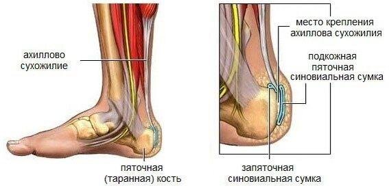 Ахиллово сухожилие скрепляет мышцы голени с задней частью пяточной кости. Это самое прочное сухожилие в человеческом теле, способное выдерживать колоссальные нагрузки. В то же время оно является и одним из чаще всего травмируемых. В точке прикрепления сухожилия к кости расположены передняя и задняя бурсы (синовиальные сумки) — похожие на мешочки структуры, в которых содержится жидкость. Они выступают в качестве амортизаторов, обеспечивая плавность движения мышц и сухожилий вдоль костной поверхности. Травмирование, развитие дегенеративно-дистрофических, воспалительных или других патологических процессов в самом сухожилии, мышце, бурсах или других близлежащих тканях сопровождается болевым синдромом.