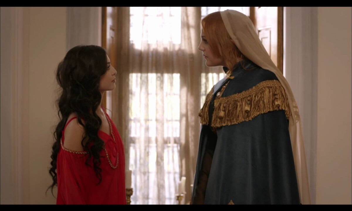 Заметим, что и это знакомство глаза в глаза тоже можно считать заочным. Хюррем прекрасно рассмотрела Изабеллу. Принцесса же воспринимает султаншу как некий обобщенный образ султанского гарема. У Мелек она поинтересуется, почему только две жены приехали. То есть, Махидевран с Хюррем у нее сливаются в одно целое без попытки рассмотреть отдельные личности.