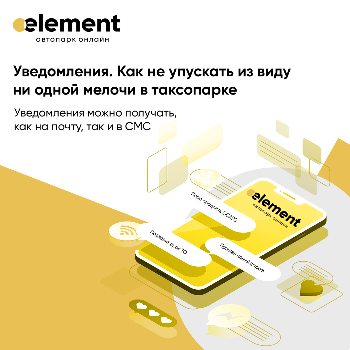 Управление таксопарком всегда требует огромного внимания. Существует большое количество процессов, за которыми нужно следить и оперативно реагировать на происходящие события. И я не говорю о таких непростых ситуациях как ДТП или угон автомобиля. Даже такие простые ситуации, как замена масла и колодок или продление полиса ОСАГО могут создать хаос в таксопарке, если вовремя не принять меры. Как не забывать оплачивать штрафы вовремя и заблаговременно знать, когда продлевать ОСАГО вам подскажет наша новая статья на Дзене. Все описанные выше проблемы, могут превратиться в задачи, если настроить все необходимые уведомления в Элементе. Уведомления можно получать, как на почту, так и в СМС. Для начала вам нужно подключить Элемент. 😄