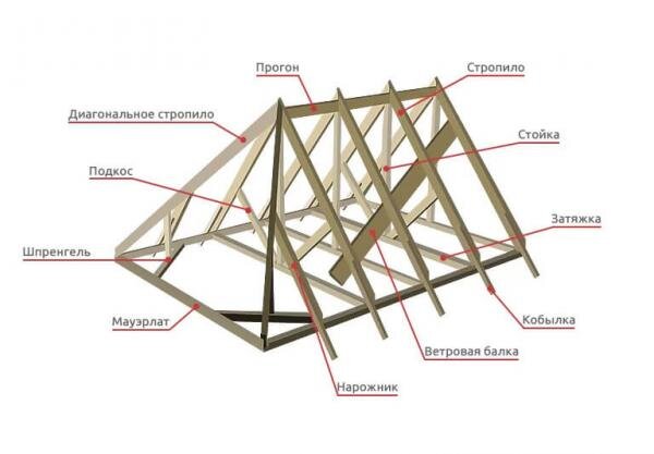 Для примера взята вальмовая кровля, т.к. ее конструкция позволяет показать максимум элементов стропильной системы.