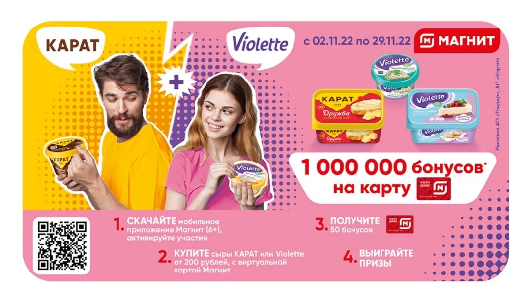 Что-то последнее время акций много , да не интересные все какие-то . На мой взгляд эта - даже если не выиграешь , купить со скидкой все равно приятно ! Со 2 ноября , то есть с сегодняшнего дня по 29 ноября 2022 года совершайте покупки сыров КАРАТ или Violette на сумму от 200 рублей в магазинах сети «Магнит», получайте бонусы и выигрывайте призы ! Призы: Участие в акции: Продукция, участвующая в акции: Сроки проведения акции: