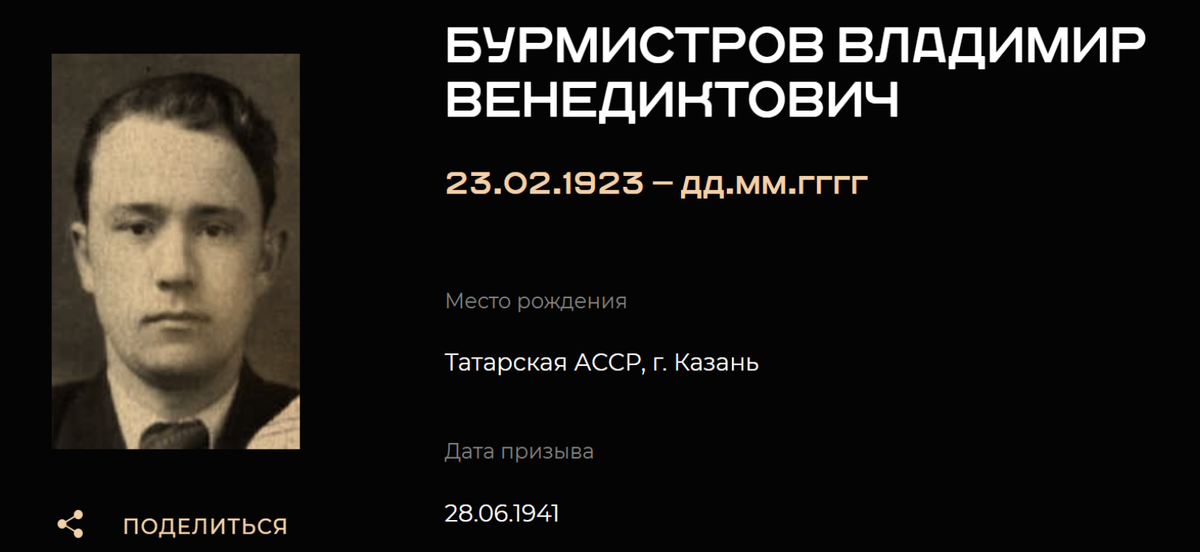 Продолжаю поиск родственников по линии отца. Бабушкин брат Бурмистров Владимир Венидиктович 23.02.1923 года рождения. Встречается так же дата 01.01.1923год. Рожден в г. Казань. Окончил Медицинский институт г. Казани 28.06.1941 был призван, участник ВОв капитан мед.службы. В августе 1951г. женился на Бурмистровой Нине Петровне? рожденной 12.04.???? преподавала в КХТИ на кафедре неорганической химии. 22.04.1953 родился сын Бурмистров Борис Владимирович. 13.06?07? 1954 родилась дочь Бурмистрова Ирина Владимировна 20 мая 1973 Владимир развелся с Ниной и 25.10.1973 году женился на Галине. В какой то период жизни Владимир проживал по адресу г. Казань ул. Красной позиции 13А кв.49 Работал патологоанатомом в г. Казань Умер Владимир в Казане 18 ноября 1987 г. Вся информация собрана из открытых источников + воспоминания+ личные записи прабабушки Бурмистровой Татьяны Николаевны матери Владимира Венидиктовича.