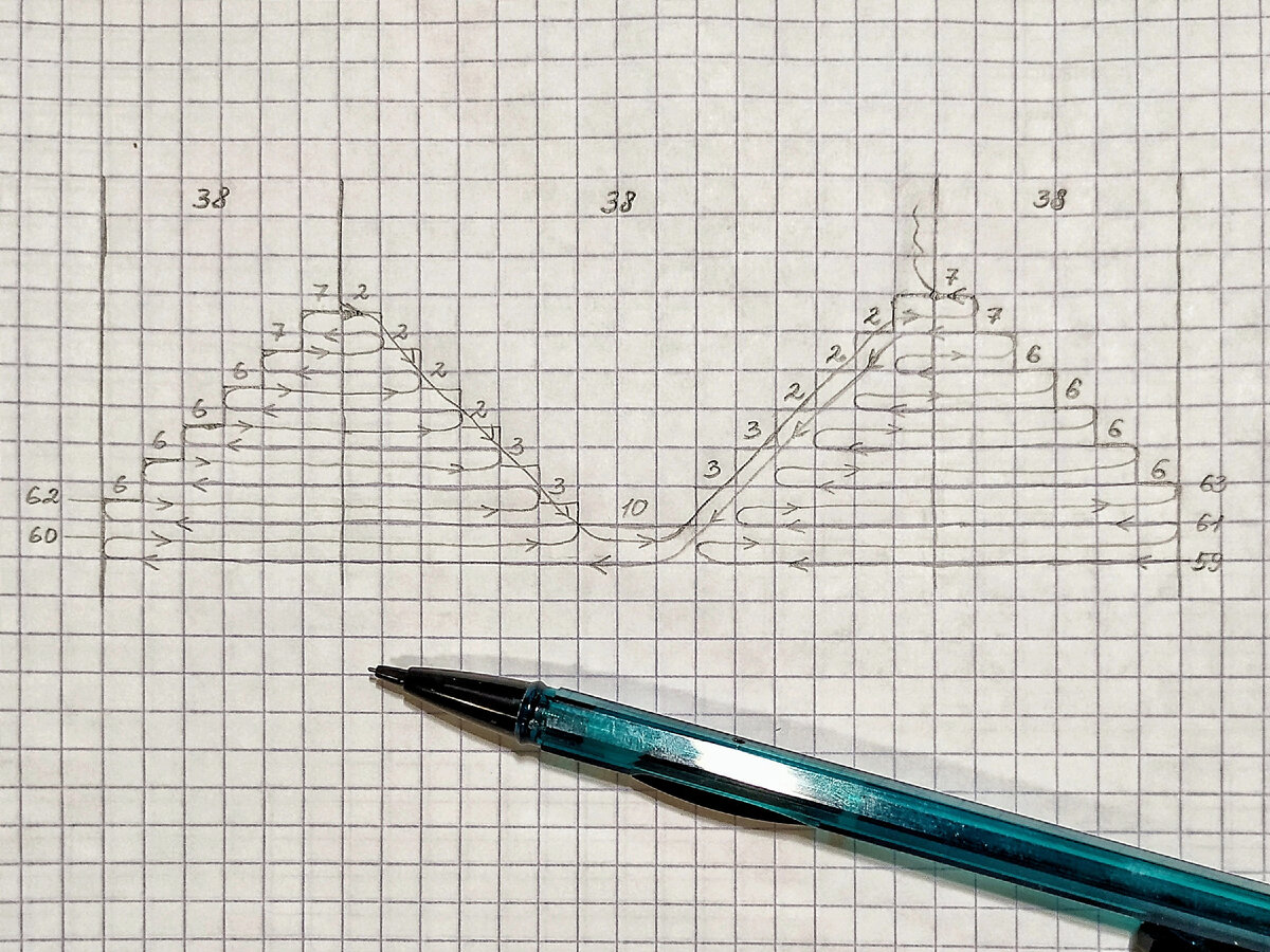 То, что вы видите на картинке – это не план похода Ивана Сусанина в компании поляков по лесам российской глубинки. И не план постройки египетской пирамиды в разрезе (хотя чем-то похоже). Это, друзья, всего лишь план вывязывания горловины укороченными рядами.