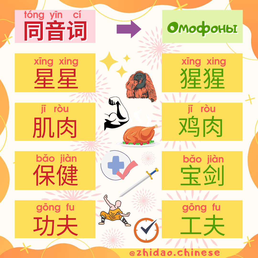 #zhidao_синонимы Сегодня предлагаем вам еще одну подборку омофонов (同音词 tóngyīncí)! 📣 В китайском языке множество слов, состоящих из одинаковых звуков, но если произнести их разными тонами, то значение может кардинально поменяться, а иногда два слова могут произноситься абсолютно одинаково, но записываться разными иероглифами и иметь разные значения 🙊 🔊 Открывайте видео и включайте звук, чтобы услышать, как произносится каждое слово! ✨ 星星 xīngxing звёзды 🦧 猩猩 xīngxing орангутан 💪 肌肉 jīròu мышцы 🍗 鸡肉 jīròu курятина 🏥 保健 bǎojiàn охрана здоровья, здравоохранение 🗡️ 宝剑 bǎojiàn меч 🤼 功夫 gōngfu кунг-фу 🕑 工夫 gōngfu время, досуг 📝 Ссылка на карточки Quizlet для изучения новых слов: https://quizlet.com/_c9t9lo?x=1qqt&i=2r5snr 📚 Хотите, чтобы Вы или Ваш ребенок заговорили на китайском? Напишите нам для записи на групповые / индивидуальные занятия! 🎓 #china #chinese #школакитайского #китайский #москва #язык #китайскиймосква #учукитайский
