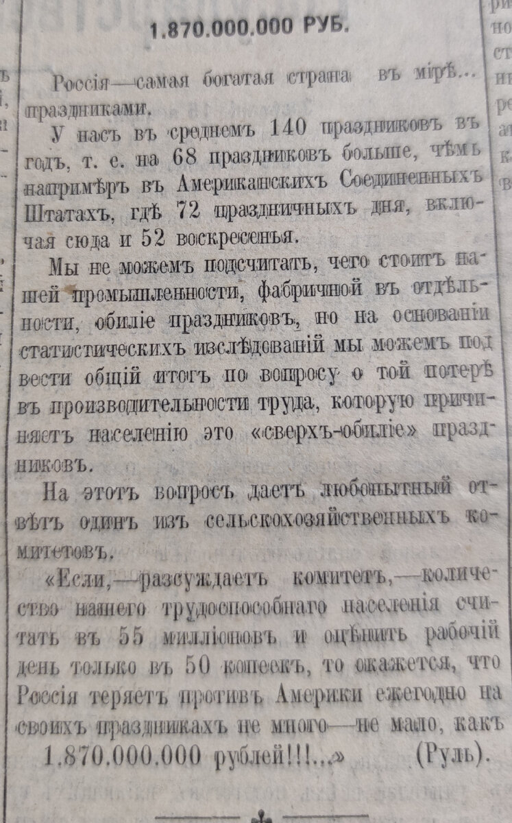 Всем привет! В газете "Пятигорское эхо" за 1914 год нашла интересную статью Умножив 83 миллиона (в среднем трудоспособное население России) на три тысячи в день (по статистике средняя зарплата в нашей стране 62000 руб в месяц) получается 24 900 000 000 000 рублей (и это если я не наврала с рублями!) в год. Да такой суммы хватит на все операции в заграничных клиниках детям, больным раком, ДЦП, сиротам, домам престарелых и инвалидам, одиноким нуждающимся и даже еще немного останется на повышение пенсий не на 200 рублей, а хотя бы на 2000. Может сможем без праздников прожить? Хотя бы годик. *** Спасибо за внимание! За понимание! За пальчики вверх👍! За комментарии и подписки! Подписывайтесь на мой канал ! Пишу на разные темы: дождливой осенью и морозной зимой - о родословной, весной и летом - о даче и саде, круглогодично - о разном женском, время от времени - о путешествиях...