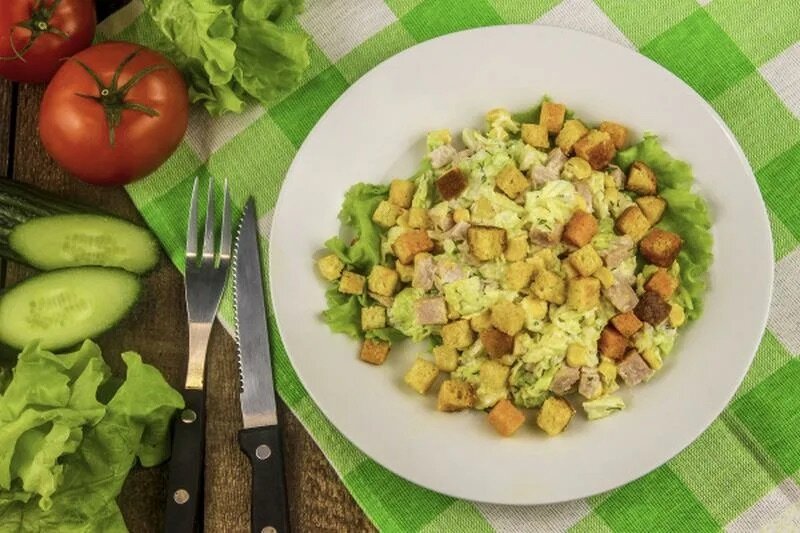 Салат «Моя прекрасная леди»* Нежный, легкий и очень вкусный салат "Моя прекрасная леди" обладает всеми достоинствами! Этот салат "Моя прекрасная леди" не раз выручал меня, когда внезапно приходили гости. Отличный получается салат! Вот такой набор продуктов понадобится для приготовления: капуста пекинская 1 кочан, 200 гр. майонез, 200 гр. ветчины, 1 баночка кукурузы и два пакетика белых сухариков. Соль по вкусу. Капусту нашинковать Ветчину порезать соломкой Из кукурузы слить жидкость и добавить в салат.Добавляем соль по вкусу и все хорошо перемешиваем. А перед самой подачей положить сухарики так как они быстро размокнут. Салат готов. Приятного аппетита.
