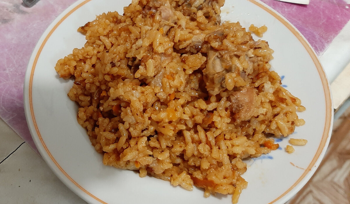 Рецепт Рис-1 стакан Куриные спинки жирные - 4 шт. Морковь крупная -1 шт. Лук - 2 шт. Приправа для плова 1 чайная ложка (по желанию) Масло растительное - 3 ст. ложки Вода - 3 стакана Соль 1/2 чайной ложки. Способ пииготовления 4 куриные спинки промыть и нарезать на кусочи и выложить на разогретую сковороду с высокими бортами. Влить 4 столовых ложки растительного масла. Все обжарить до удаления жидкости. Мелко нарезать лук Все залить 3 мя стаканами воды и довести до кипения. Добавить 1 чайную ложку приправы для плова (по желанию) Огонь убавить на минимальный и под крышкой варить 20-25 минут. Печь выключаем и оставляем на плите упревать (20-25 минут) Открываем крышку и все перемешиваем. Плов готов. Приятного аппетита!