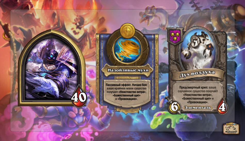 Стартовая кривая: 1 уровня таверны, жадная кривая или классическая (все о стартовых кривых) Простой герой с пассивной способностью, которая делает сильнее одну угрозу на столе. Как и всегда, сила героя отлично работает с Таресгосой, АоЕ атаками, Страшным арой, ядами и Жутким адмиралом Элизой. Сможете собрать эти комбинации и получите серьезное преимущество. Старайтесь держать на столе еще несколько провокаций, чтобы мелкие угрозы оппонента не гарантированно сбивали с вашего левого существа божественный щит. Интересны комбинации с компаньоном. В обычных условиях его чаще всего располагают во втором слоте слева, чтобы он быстро активировал свой предсмертный хрип. Как правило компаньона оставляют на столе до самого конца игры, а иногда даже комбинируют его со Страшным арой и реже с Бароном Ривендером. Такие комбинации эффектные, но не самодостаточные — на столе должны быть другие угрозы с хорошими хар