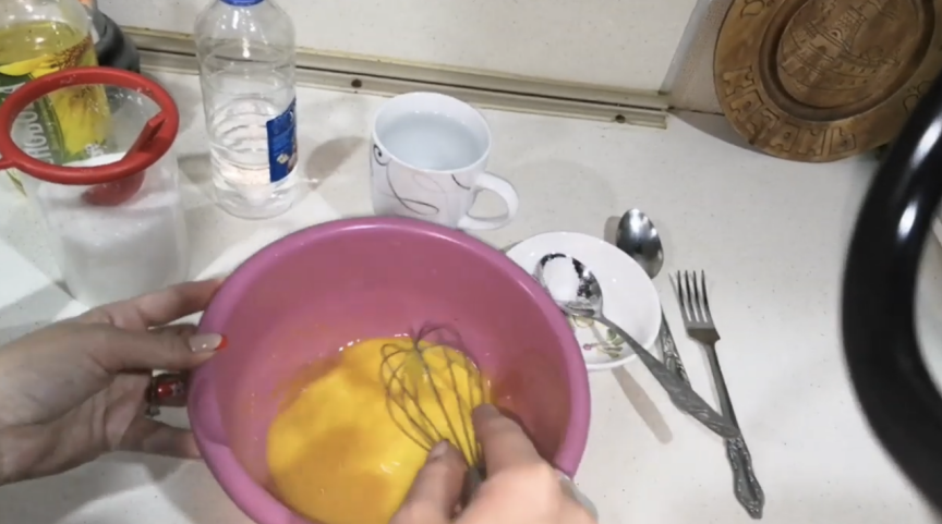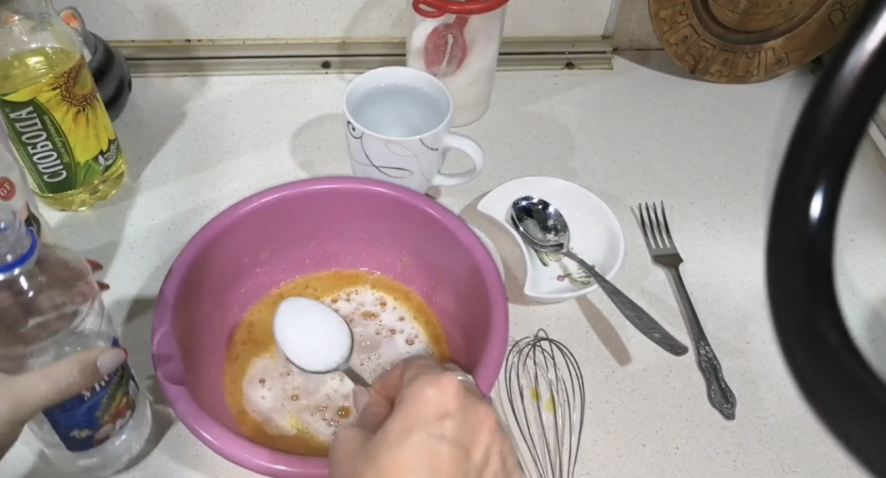 Следом к яйцам отправляем соль, сахар, гашеную соду и продолжаем взбивать, до однородной массы. Вливаем в нашу смесь кипяченую воду, растительное масло.