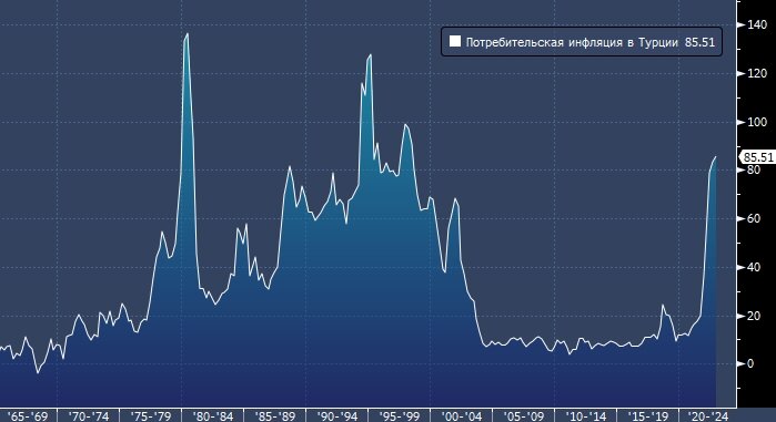 Потребительские цены выросли на 85,5% в годовом исчислении в прошлом месяце. Власти возлагают вину на внешние факторы и отказываются повышать ставку для торможения экономики Годовая инфляция в Турции ускорилась 17-й месяц подряд в октябре из-за роста цен на продукты питания и высоких цен на энергоносители, достигнув своего вероятного пика за два десятилетия пребывания у власти президента Реджепа Тайипа Эрдогана. Потребительские цены выросли на 85,5% в годовом исчислении по сравнению с прошлым месяцем, как показали официальные данные в четверг, что немного ниже медианного прогноза в обзоре Bloomberg. Месячная инфляция составила 3,54%, что также немного ниже оценки отдельного опроса. Годовая инфляция на продукты питания и безалкогольные напитки, составляющие около четверти потребительской корзины, в прошлом месяце составила 99,1% по сравнению с 93,1% в сентябре. Политики возлагают вину за инфляцию на высокую стоимость товаров, отчасти вызванную конфликтом России и Украины, а также на дру