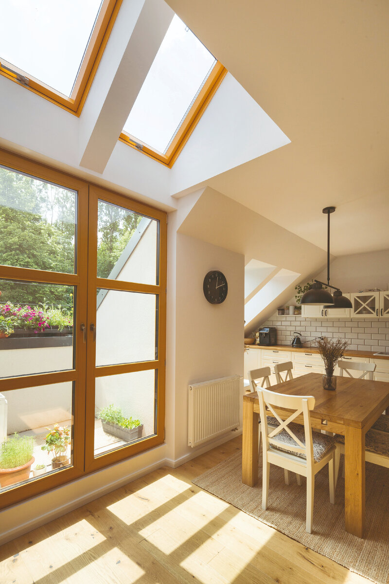 Мы уже говорили про вентиляцию на мансарде, но в случае с кухней нужно продумывать её намного тщательнее, ведь у нас итак есть 2 источника тепла: крыша, которая нагревается первой и тёплый воздух, который поднимается с других этажей наверх, так мы ещё и готовим, поэтому вентиляция – одна из важнейших частей кухни, которая позволит эксплуатировать дом дольше. У большинства мансардных окон FAKRO есть вентклапан, который позволяет проветривать помещение даже при закрытом окне. Также в каждом мансардном окне расположена створка закрывания с 2-мя режимами микропроветривания. Ну и конечно, не стоит забывать про принудительное проветривание, что тоже является частью вентиляции.