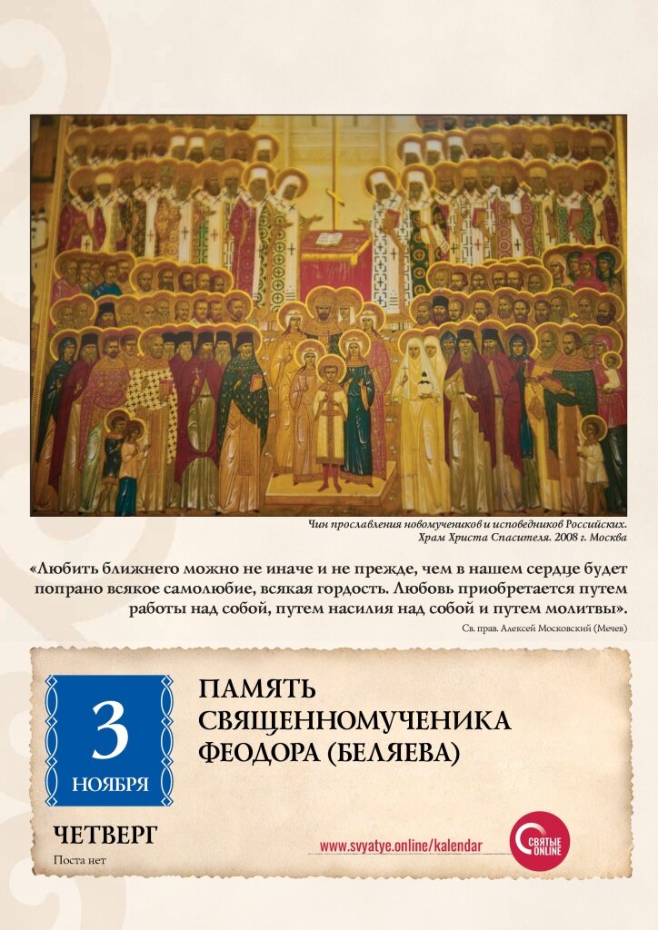 ЛЮБИТЬ БЛИЖНЕГО МОЖНО НЕ ИНАЧЕ И НЕ ПРЕЖДЕ, ЧЕМ В НАШЕМ СЕРДЦЕ БУДЕТ ПОПРАНО ВСЯКОЕ САМОЛЮБИЕ, ВСЯКАЯ ГОРДОСТЬ. ЛЮБОВЬ ПРИОБРЕТАЕТСЯ ПУТЕМ РАБОТЫ НАД СОБОЙ, ПУТЕМ НАСИЛИЯ НАД СОБОЙ И ПУТЕМ МОЛИТВЫ. Св. прав. Алексей Московский Мечев Священномученик Феодор (Беляев) Будущий священномученик родился 12 ноября 1867 года в селе Везгум Белозерской волости Новгородской губернии в семье священника Евгения Беляева. В 1889 году окончил Олонецкую Духовную семинарию, был рукоположен в сан священника. Служил в Троицком храме села Улома Череповецкого уезда. Здесь же батюшку арестовали в 1919 году, но вскоре освободили. В марте 1922 года прихожанам Троицкой церкви в с. Улома стало известно, что власти собираются прислать комиссию для изьятия церковного имущества. 28 марта среди жителей волости прошел слух, что в Улому за церковными ценностями приехала делегация из Череповца. Перед зданием Уломского исполокома собралась толпа в две тысячи человек, которые заявили, что ни в коем случае церковных ценност