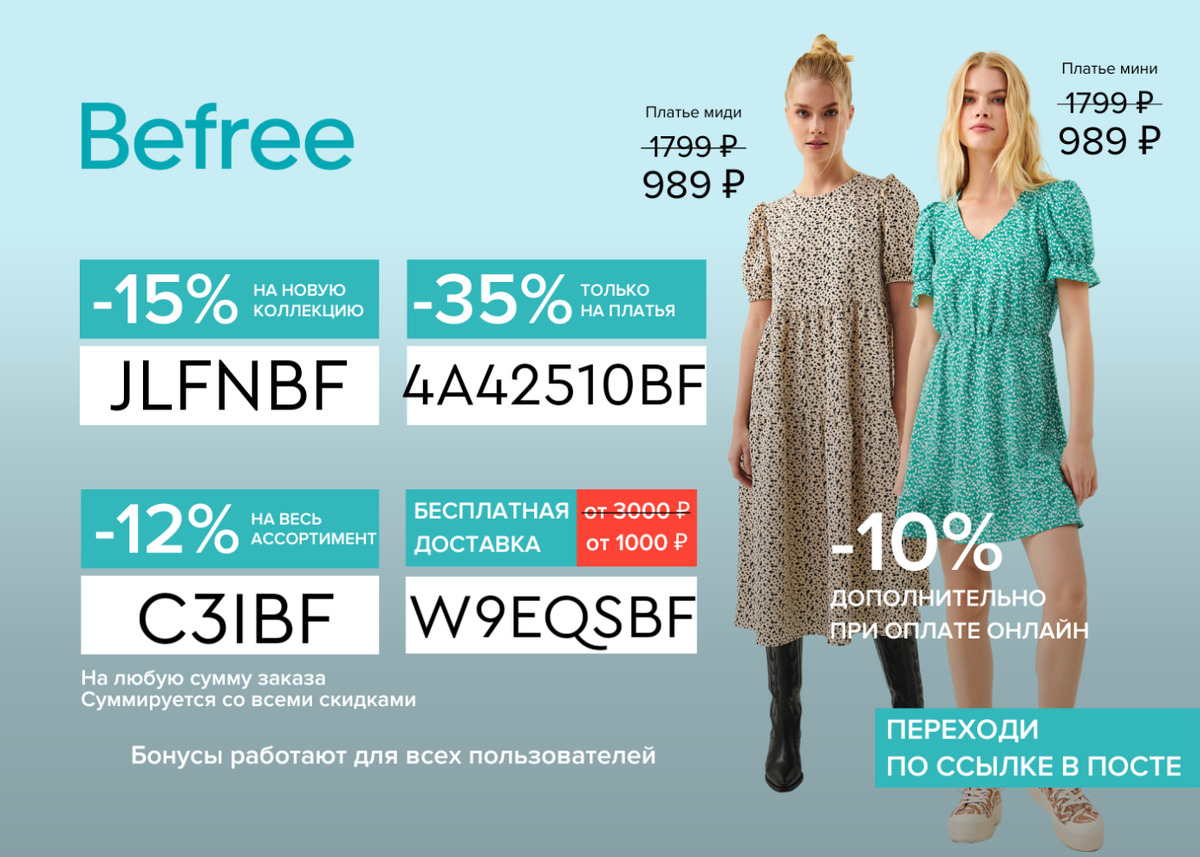Скидка 35% на все платья Красное или нейтральное, утепленное или легкое - выбор за тобой. В befree можно получить визуальное удовольствие при выборе платья на любую вечеринку или просто для повседневной жизни! И именно сейчас можно получить огненную скидку 35% на любое платье по промокоду 4A42510BF (суммируется с акциями). А если очень хочется дополнить образ стильным тренчем или модными ботинками, то забирай любую скидку на выбор: JT1HBF - скидка 15% на новую коллекцию; C3IBF - скидка 12% на весь ассортимент (суммируется со всеми акциями); EWGSIBF - бесплатная доставка от 1000р (вместо 3000р). Бонусы суммируются со скидкой при оплате онлайн 10%. Переходи по ссылке https://befree.prfl.me/6338a2feb741fb6da1c1f6a7/79fed5c3e3d2 и забирай платье своей мечты, и не только.