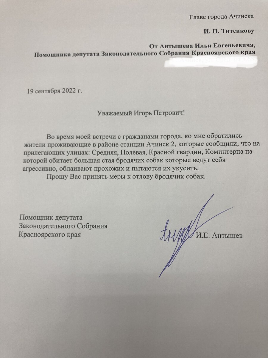 Помощник депутата Законодательного собрания Красноярского края Новак Андрей Петрович от партии КПРФ: Антышев Илья Евгеньевич провел встречу с гражданами города Ачинск, 19 сентября 2022 года. Во время встречи с гражданами проживающими в районе станции Ачинск-2, которые сообщили, что на прилегающих улицах: Средняя, Полевая, Красной гвардии, Коминтерна обитает большая стая бродячих собак которые ведут себя агрессивно. Было составлено соответствующее заявление в администрацию города Ачинск с решением данной проблемы.